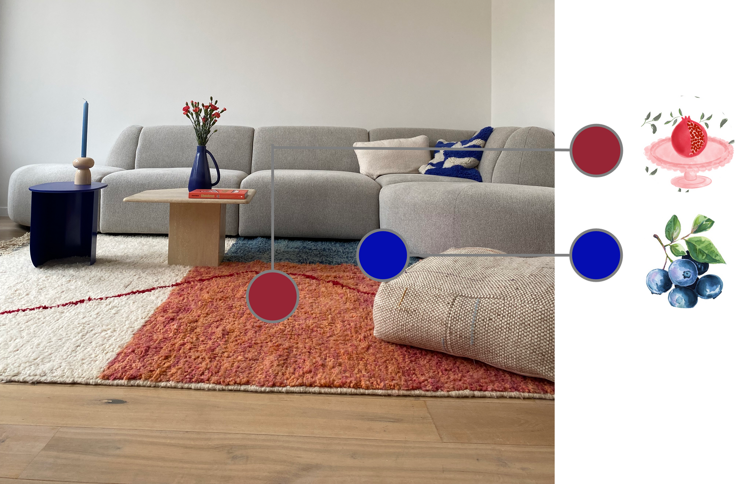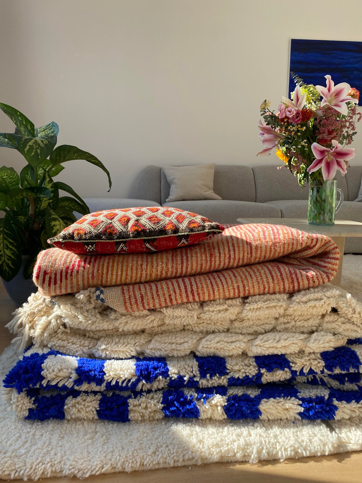 All carpets are handmade in the Atlas Mountains of Morocco by local artisans In the region Oued zem and Boujaad, where woman have been weaving carpets for generations.