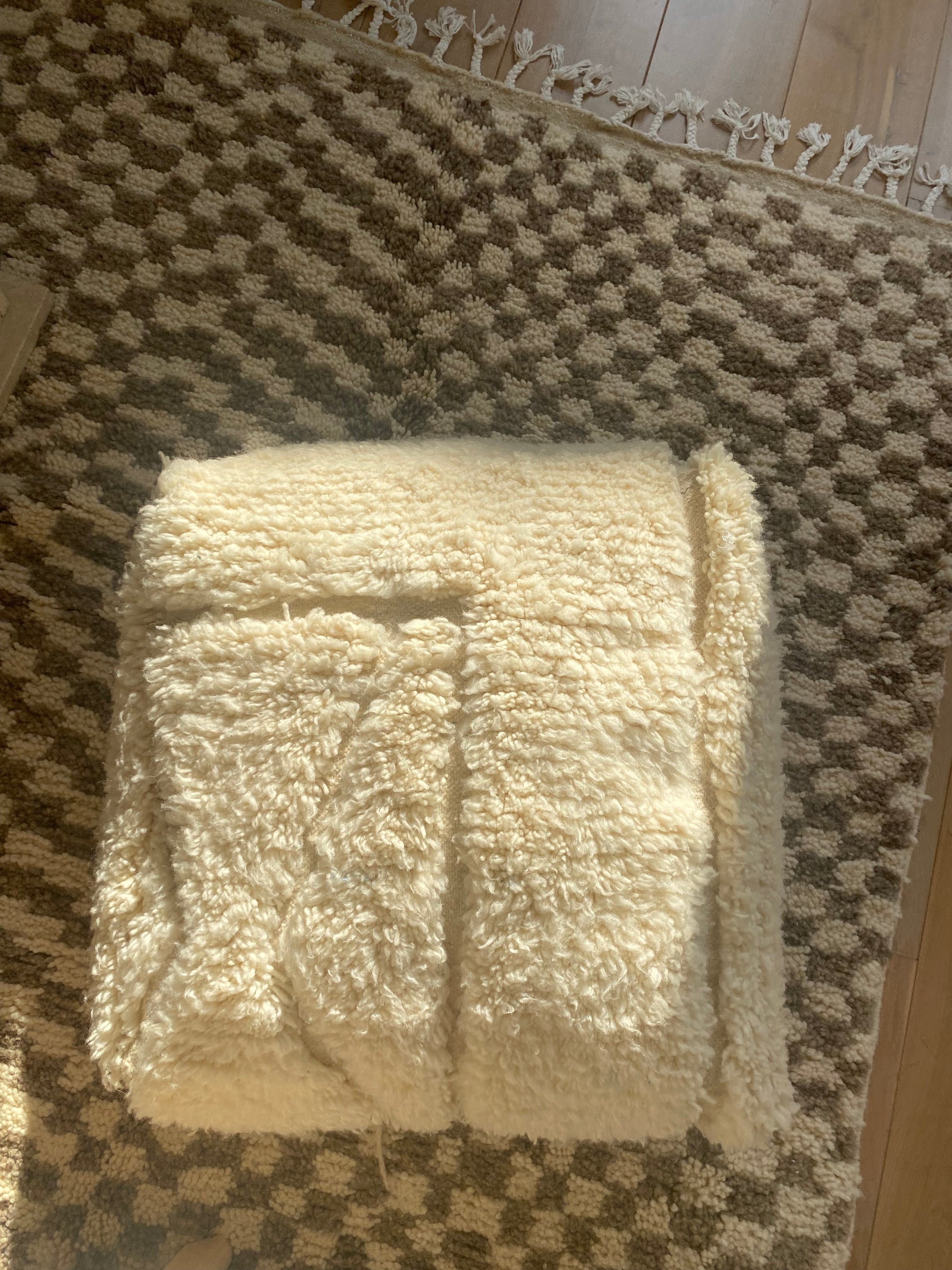 This beige fluffy pouf is a unique addition to your living room, the material is recycled from antique carpets, making this a one-of-a-kind piece