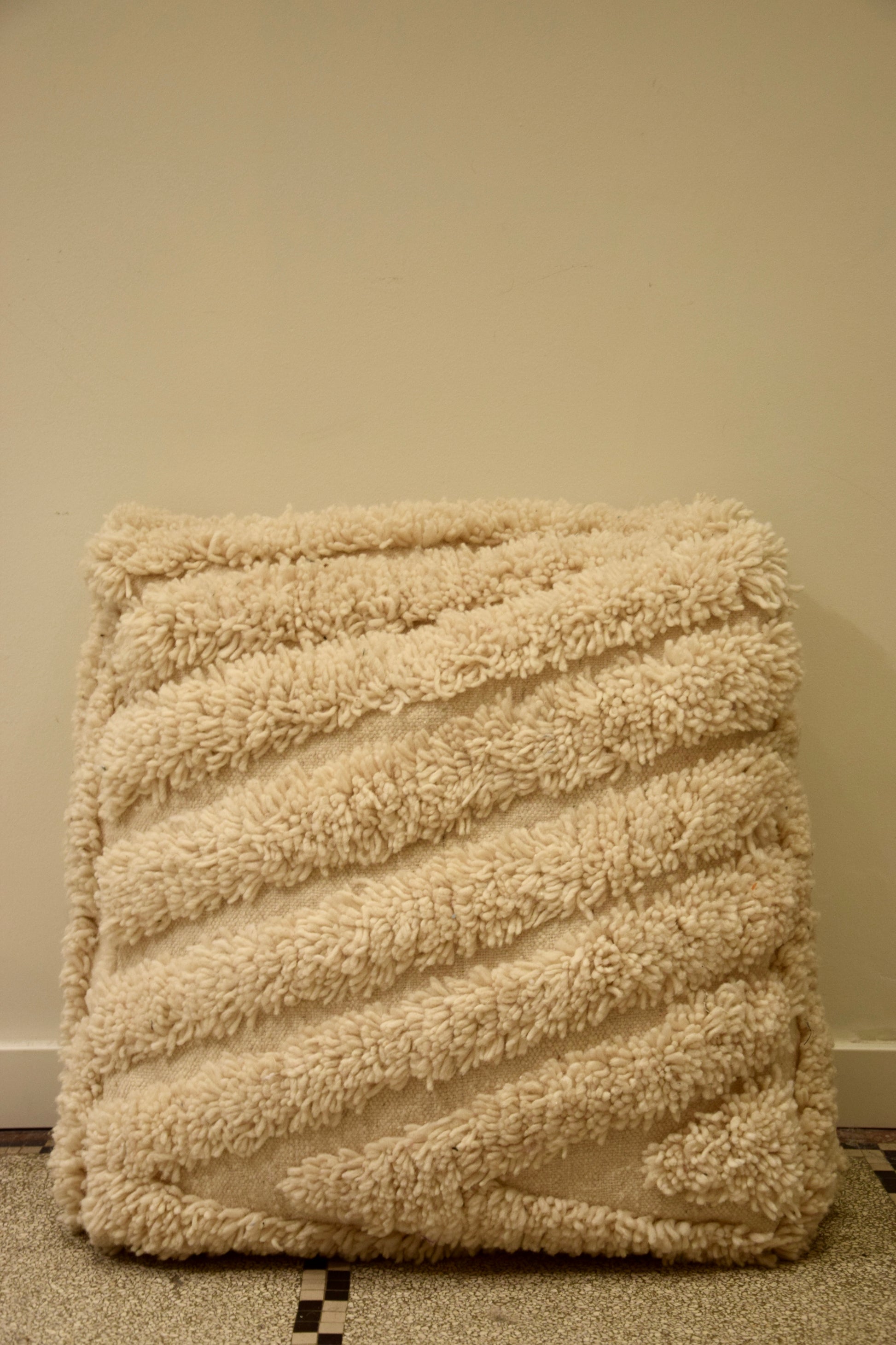 This beige fluffy pouf is a unique addition to your living room, the material is recycled from antique carpets, making this a one-of-a-kind piece