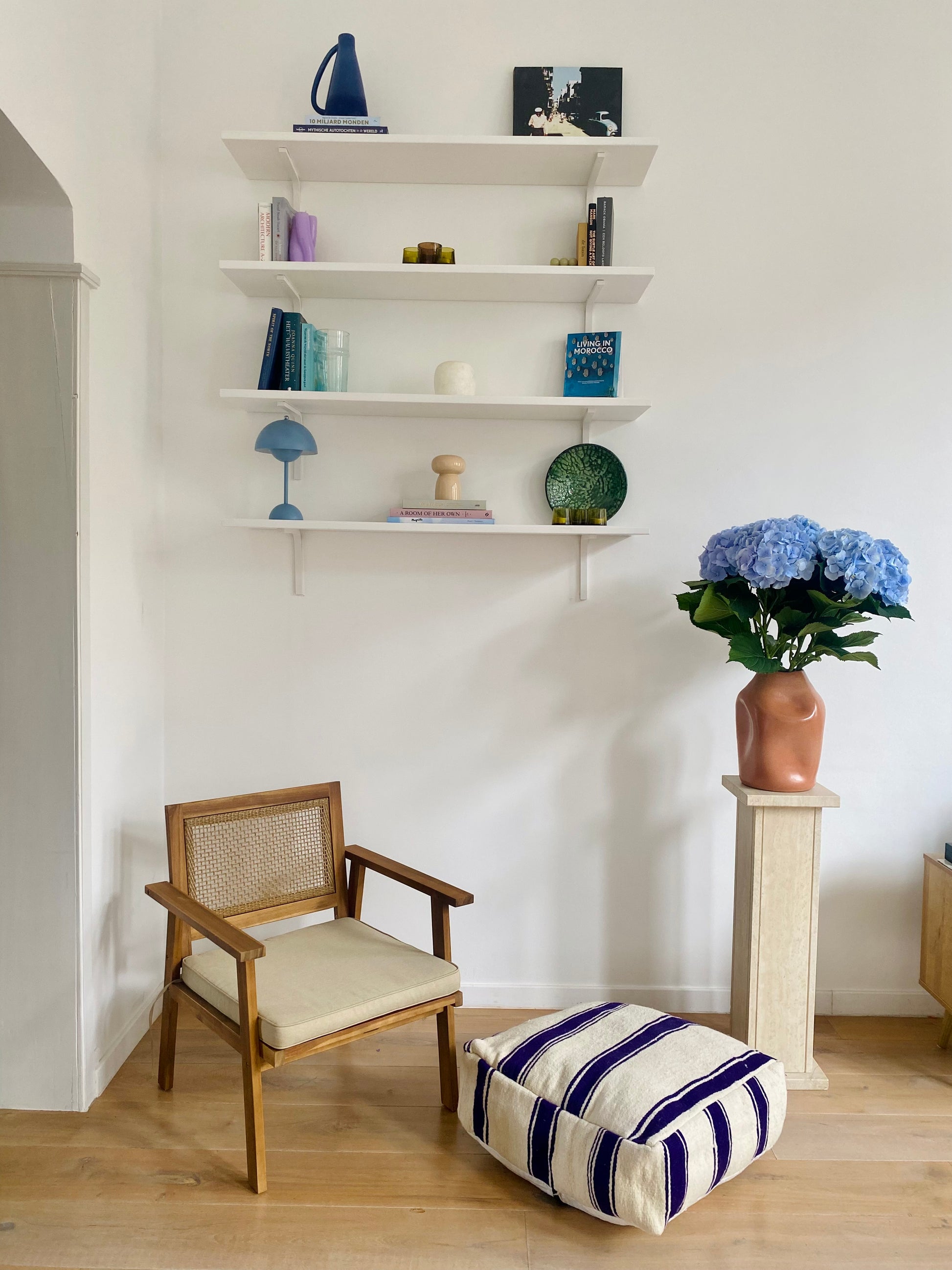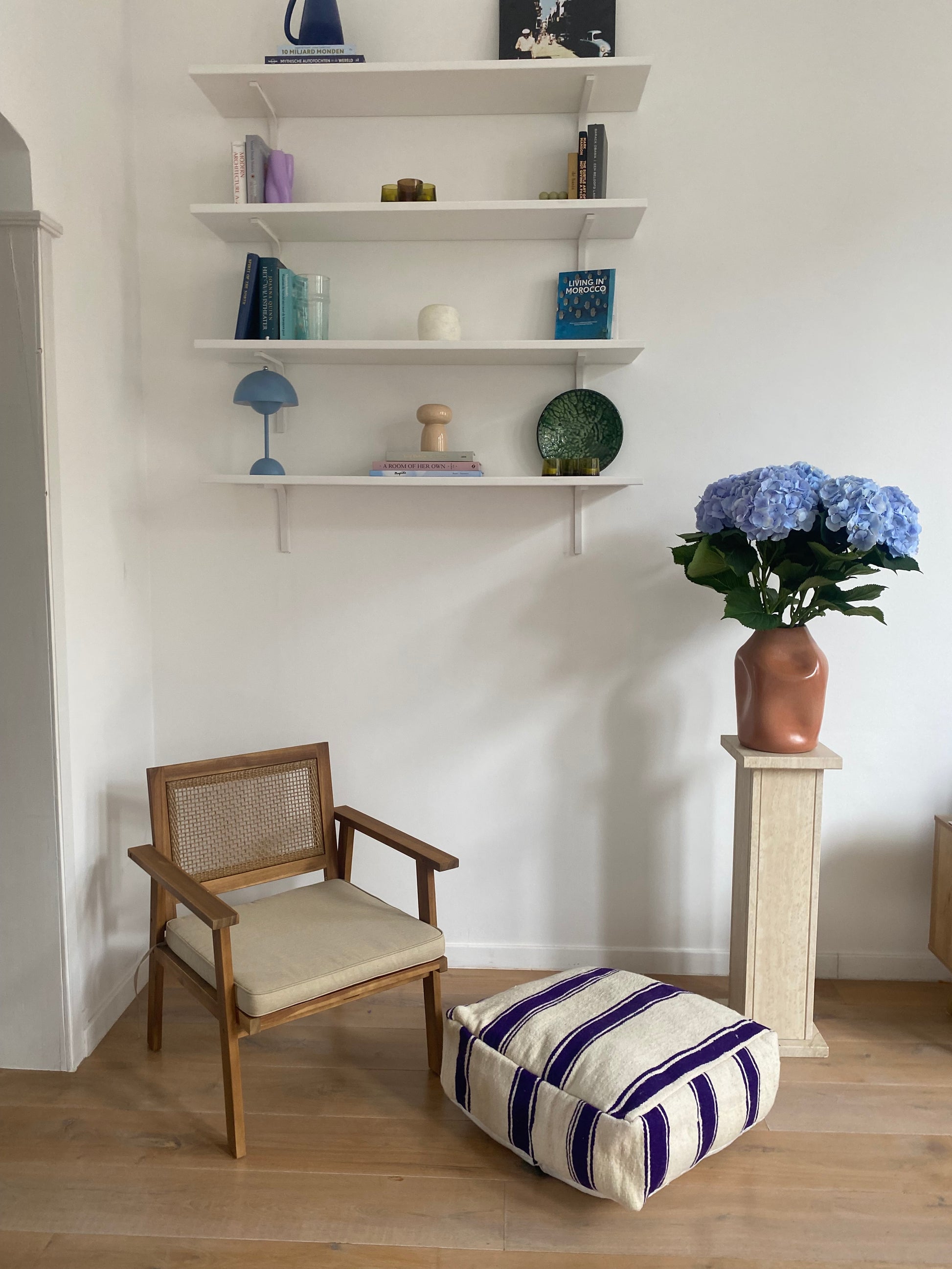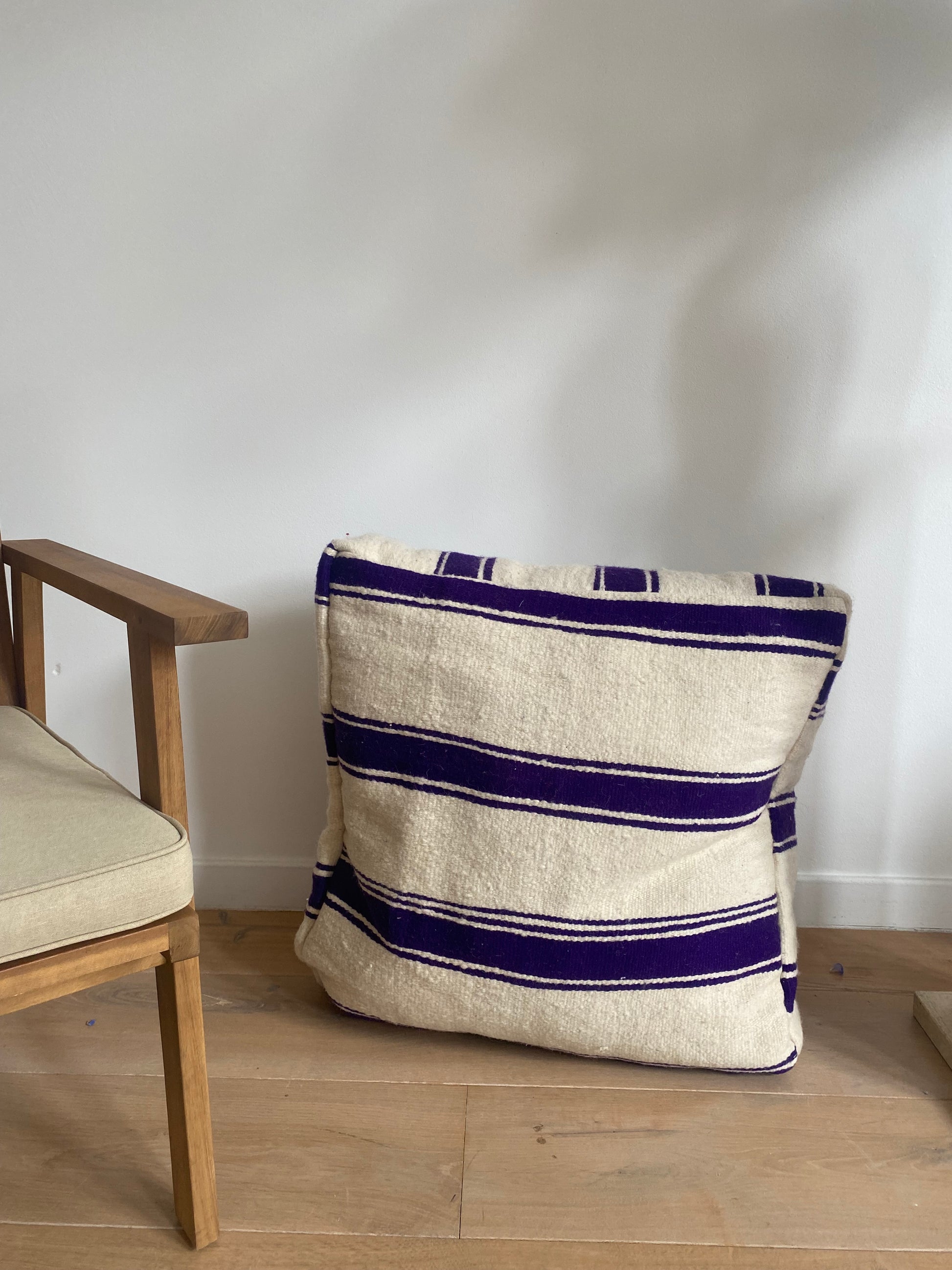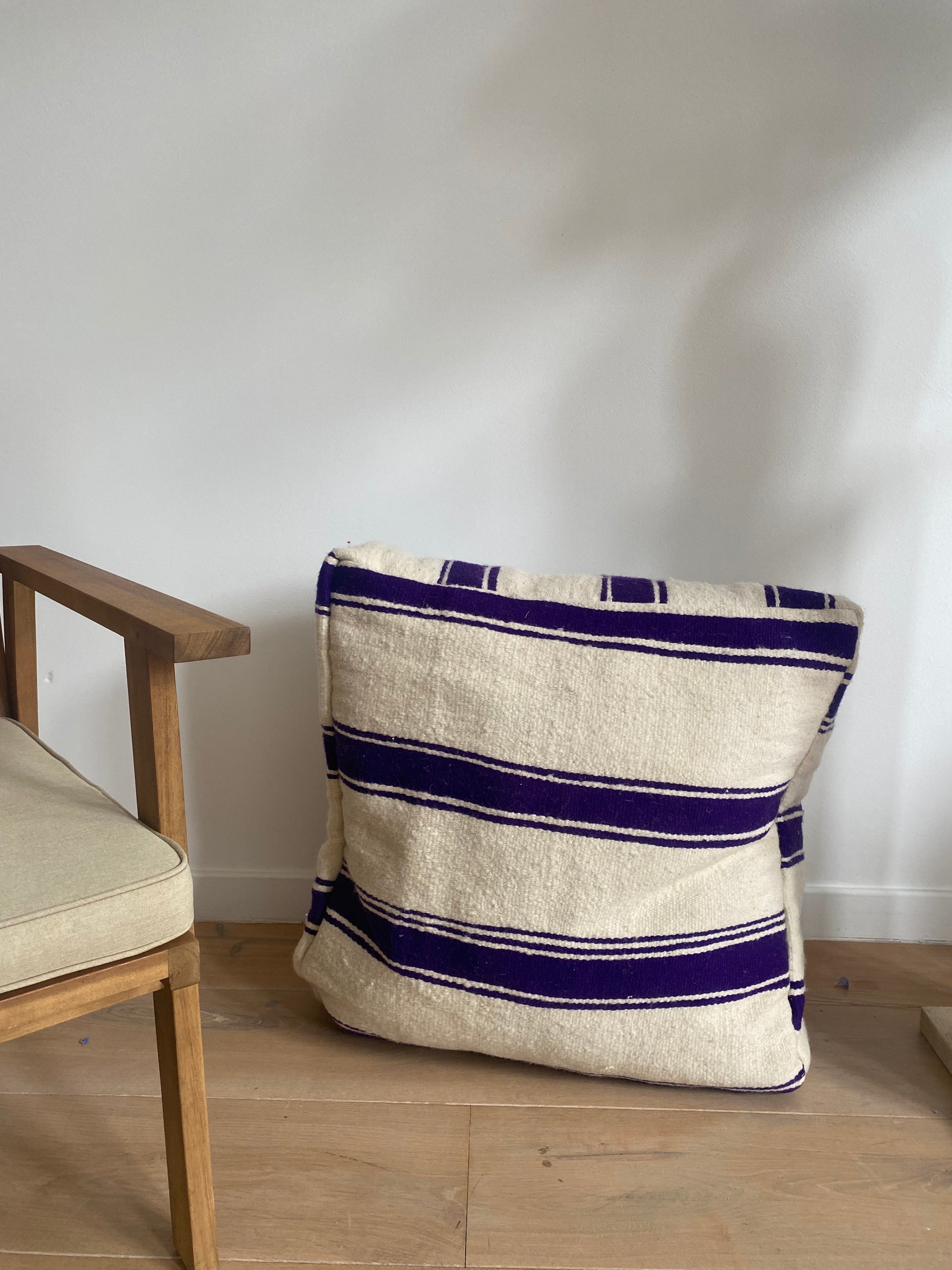 This dark blue striped pouf is a fun and unique addition to your living room, the material is recycled from antique carpets, making this a one-of-a-kind piece