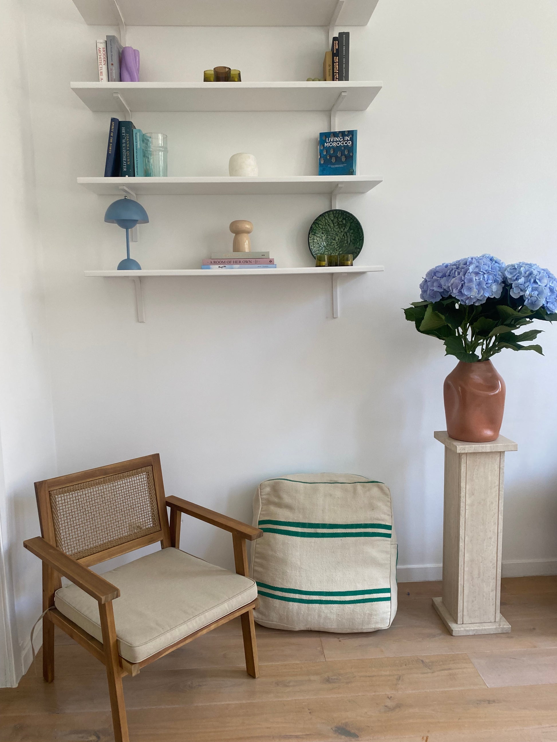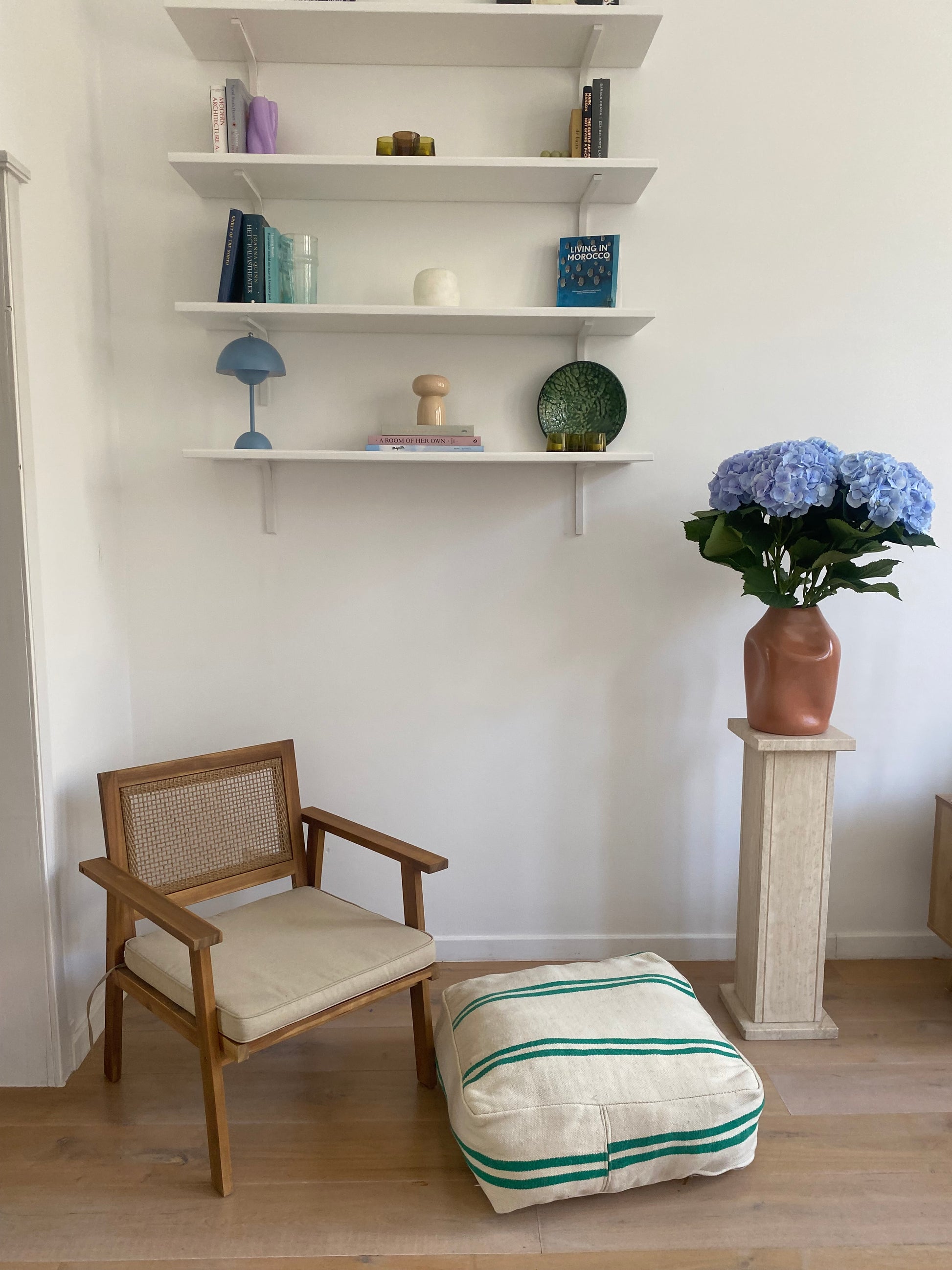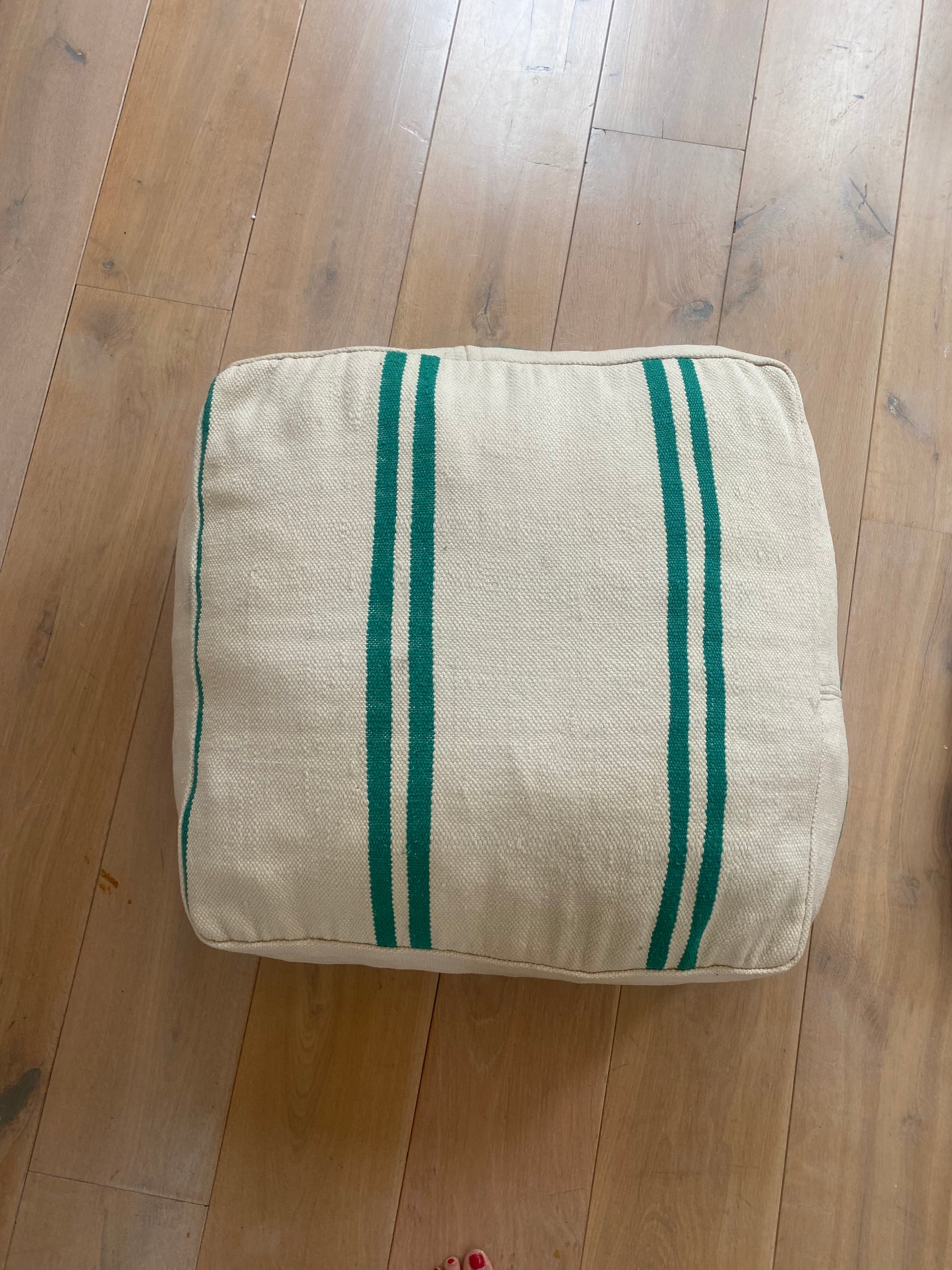 This green striped pouf is a unique addition to your living room, the material is recycled from antique carpets, making this a one-of-a-kind piece