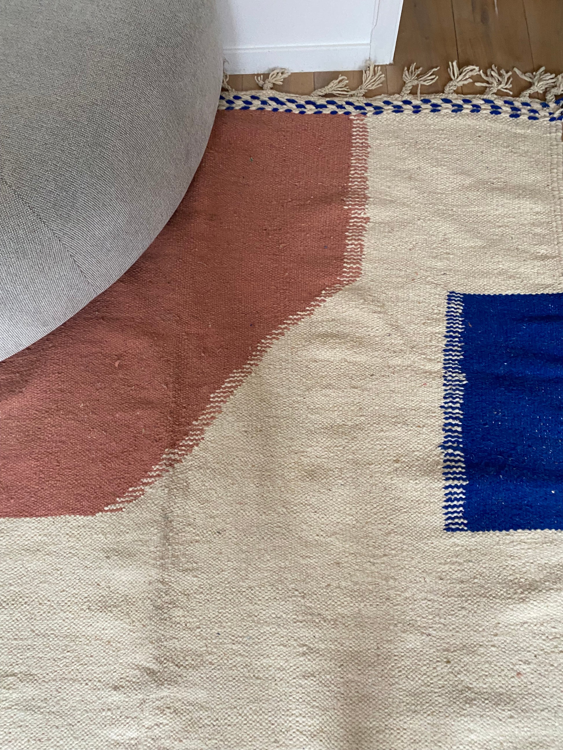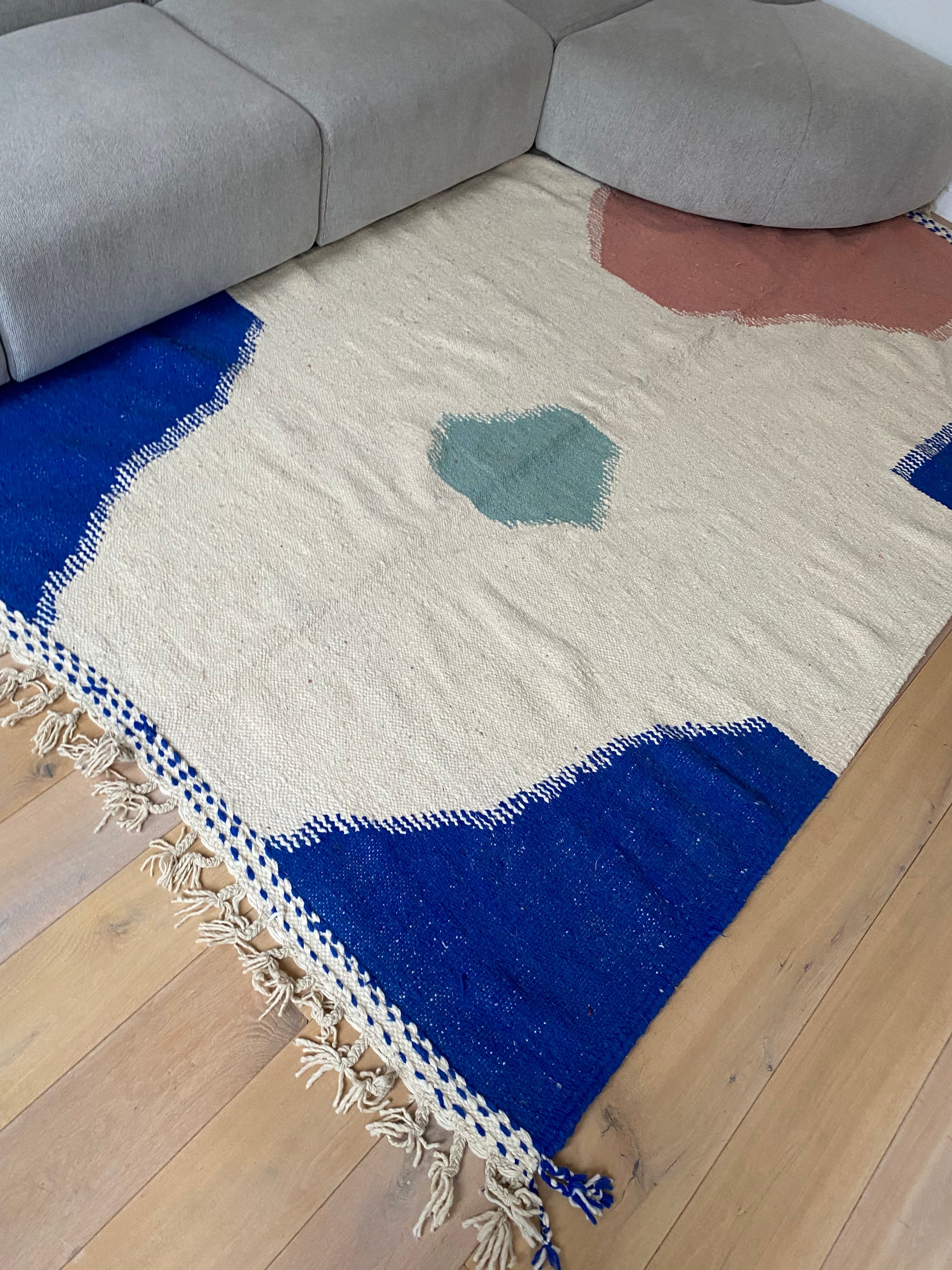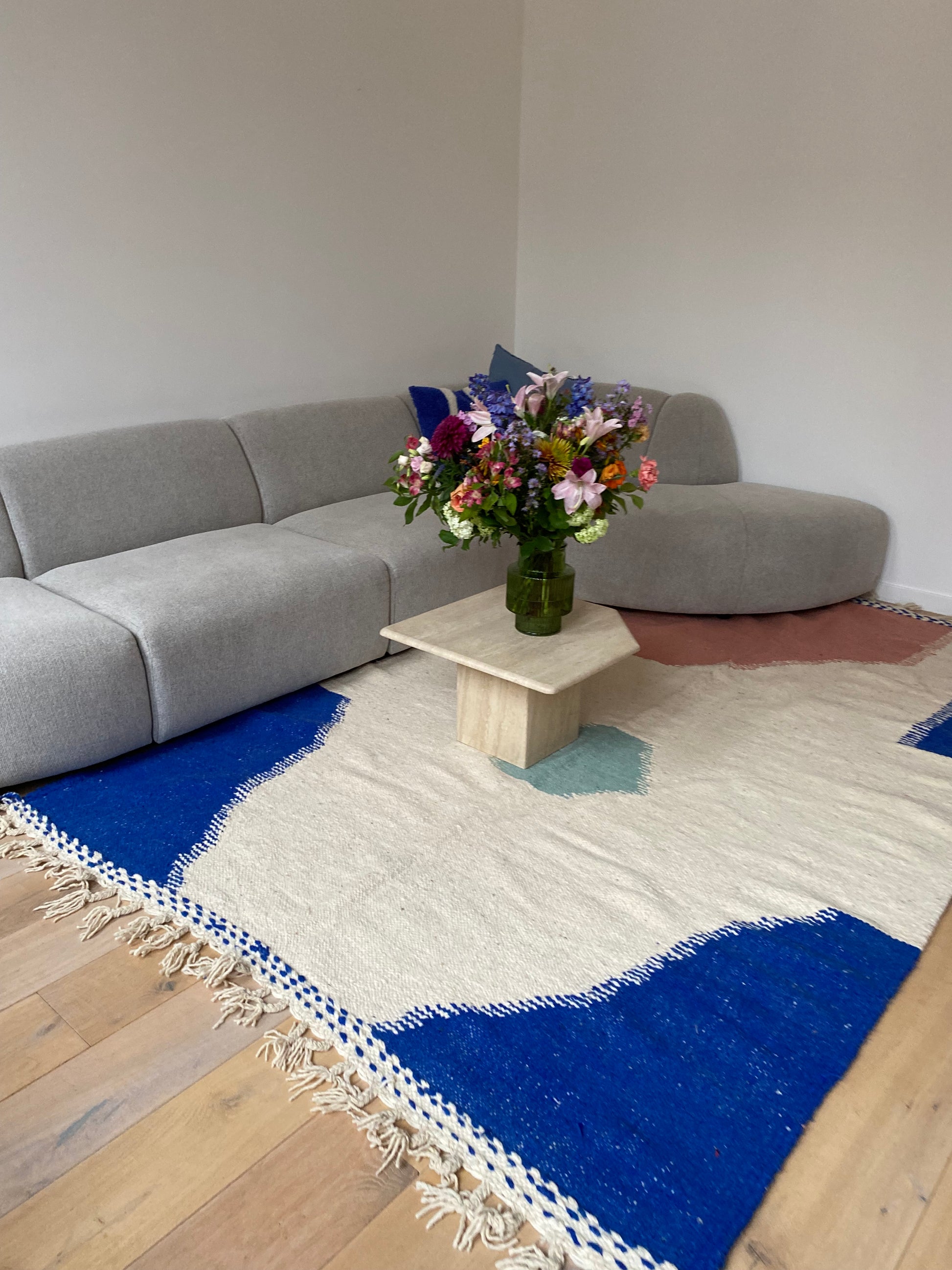 Add a touch of spice to your space with this fluffy cobalt, pink & green colored carpet the abstract designs, making it a real eye-catcher in your interior!