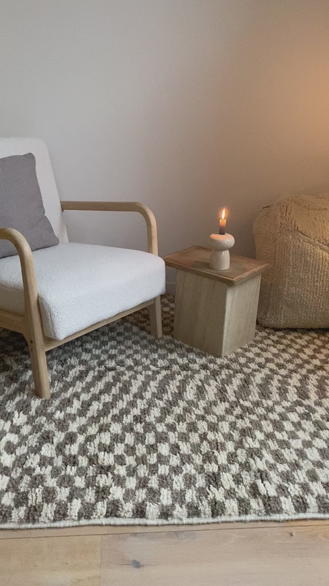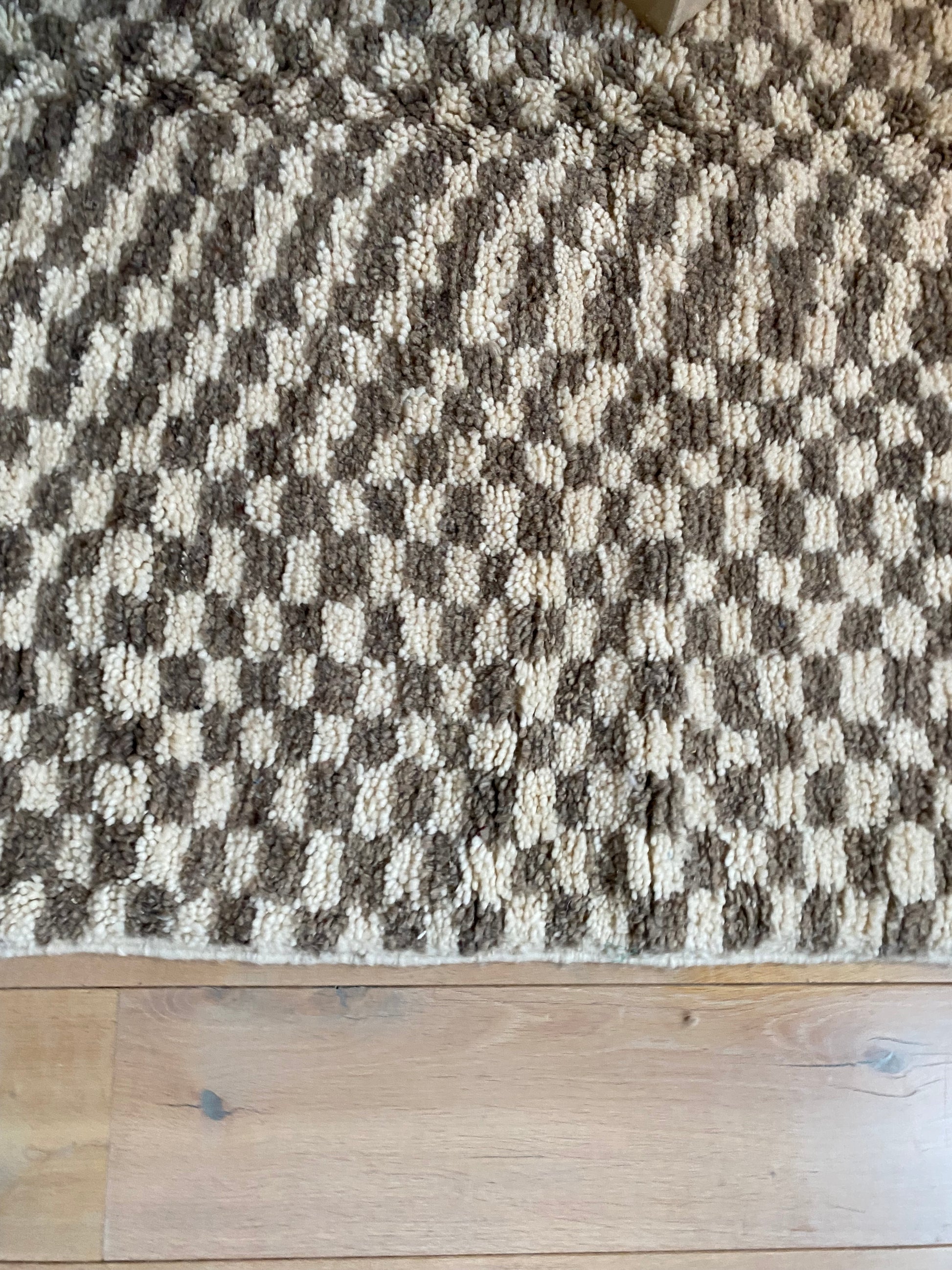 Add a some spice to your space with the captivating charm of a Moroccan beige checkered carpet. Its pattern, bright contrast and soft wool will make you feel like you just made a trip to medinas