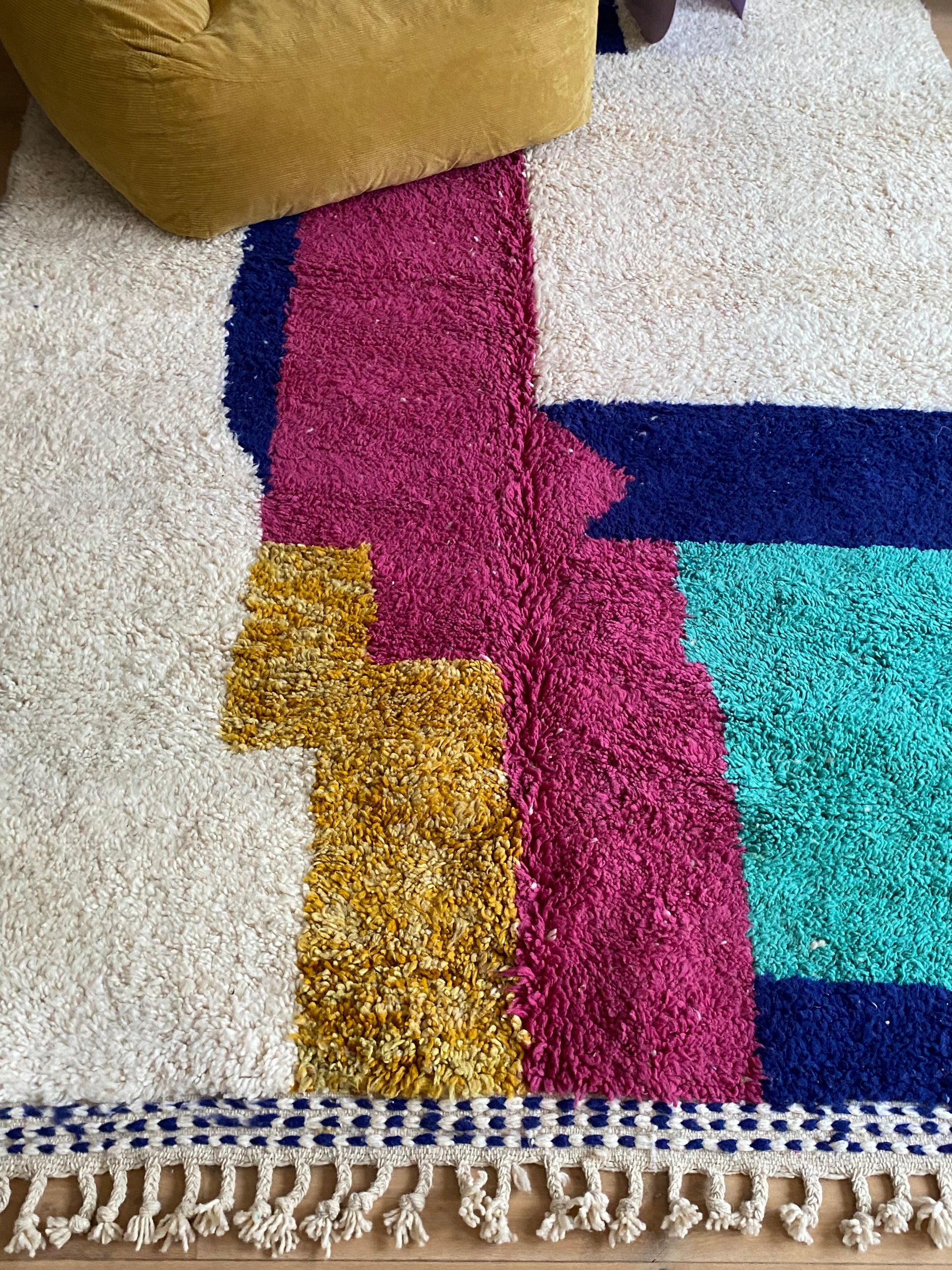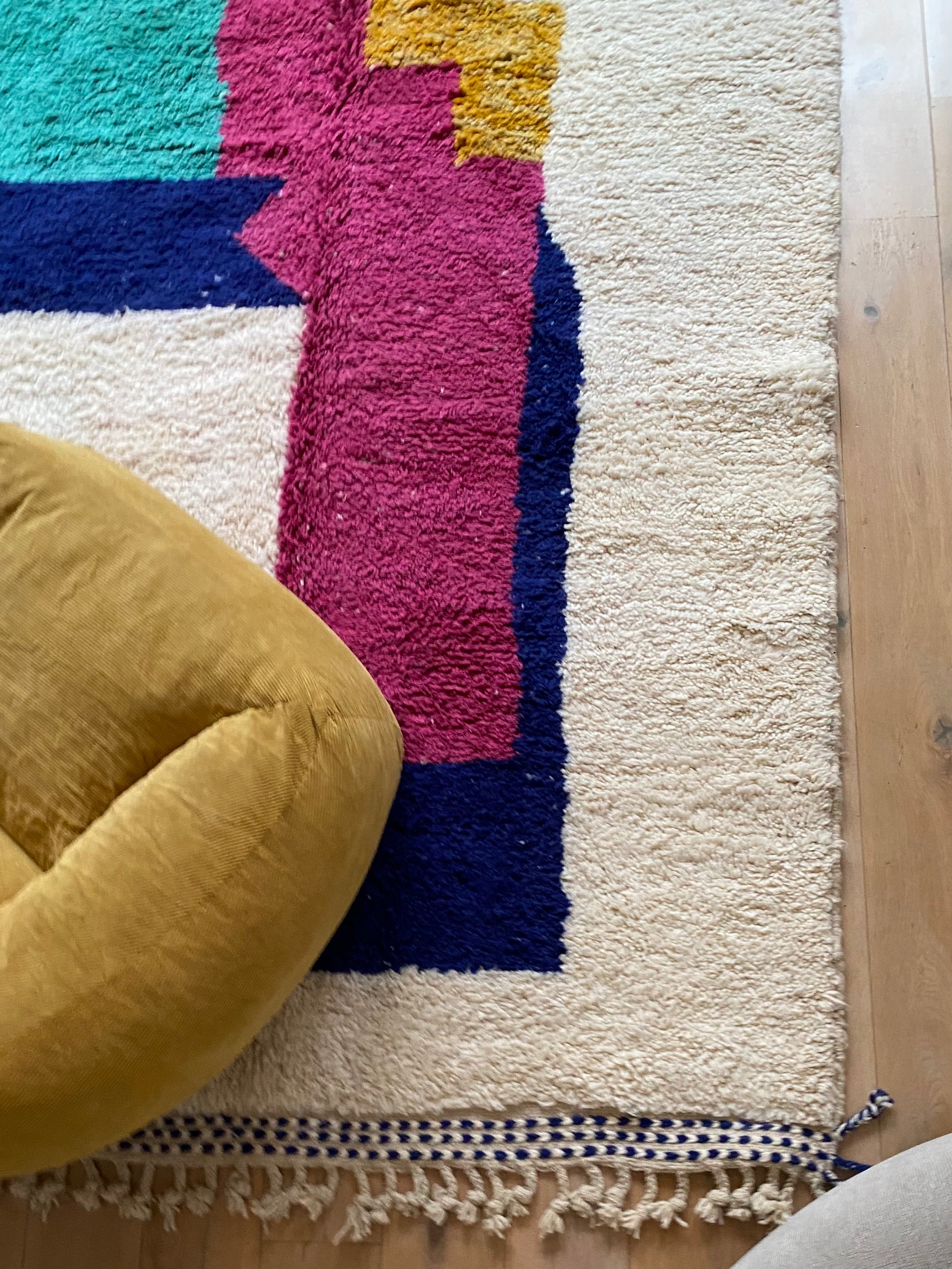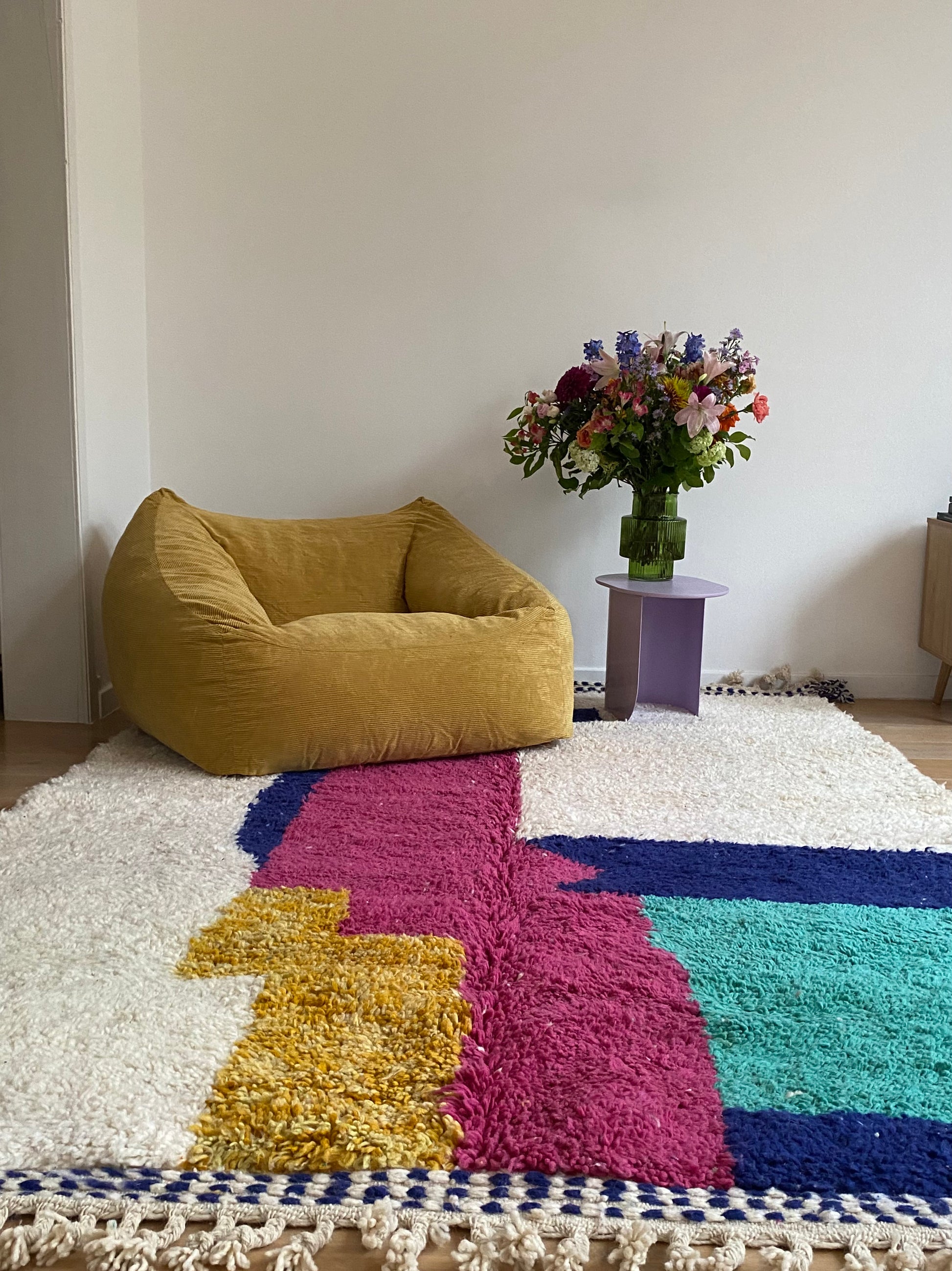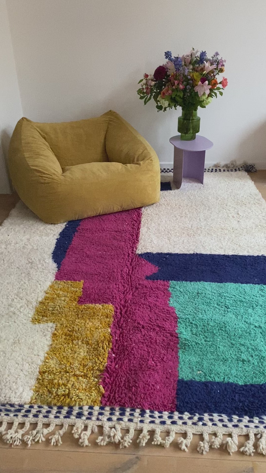 Add a touch of spice to your space with this fluffy magenta, blue & ochre colored carpet the abstract designs, making it a real eye-catcher in your interior!