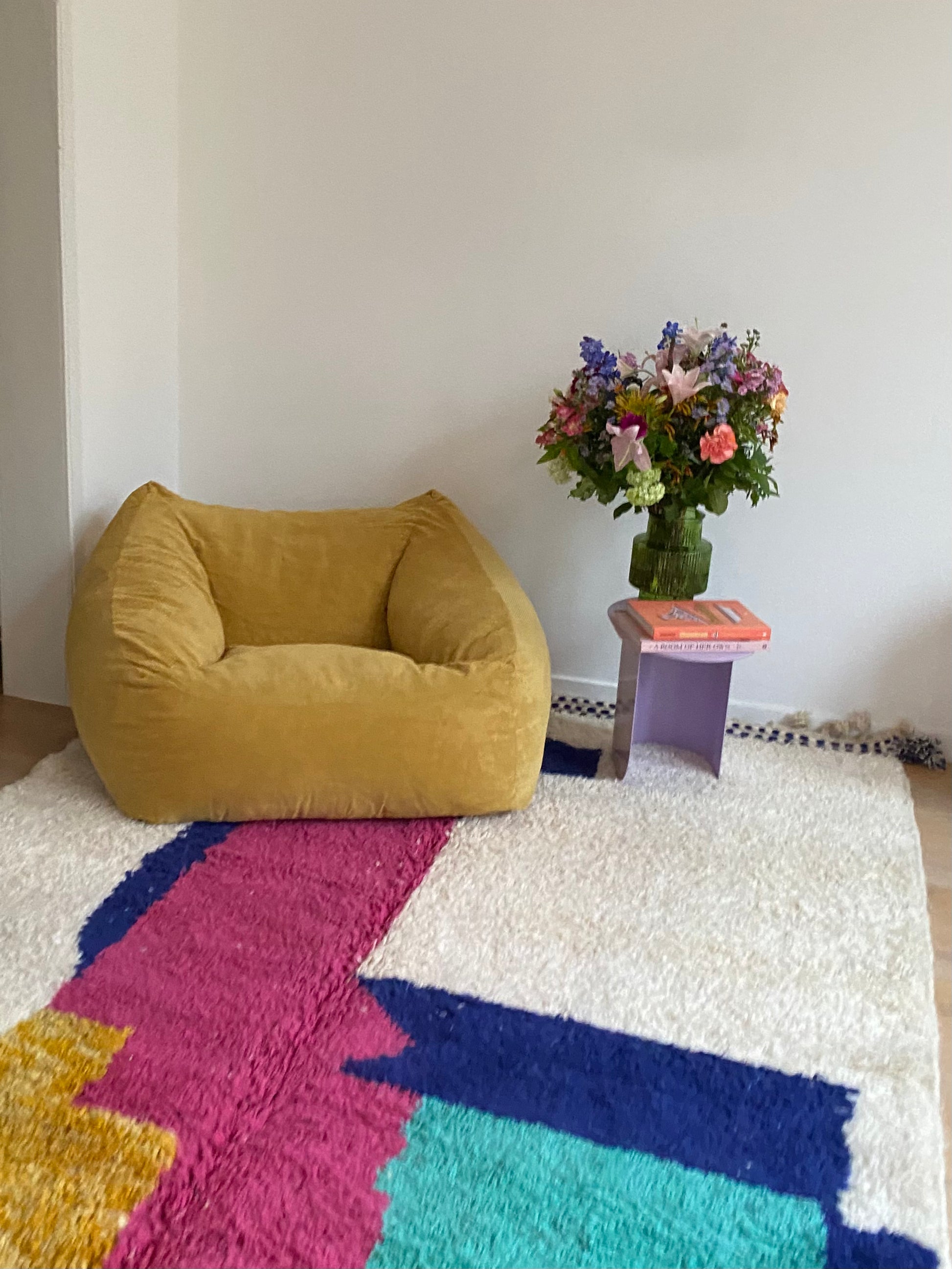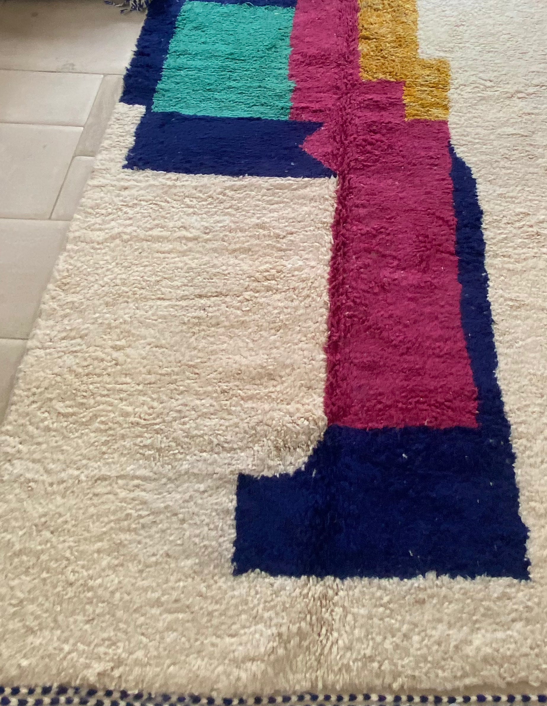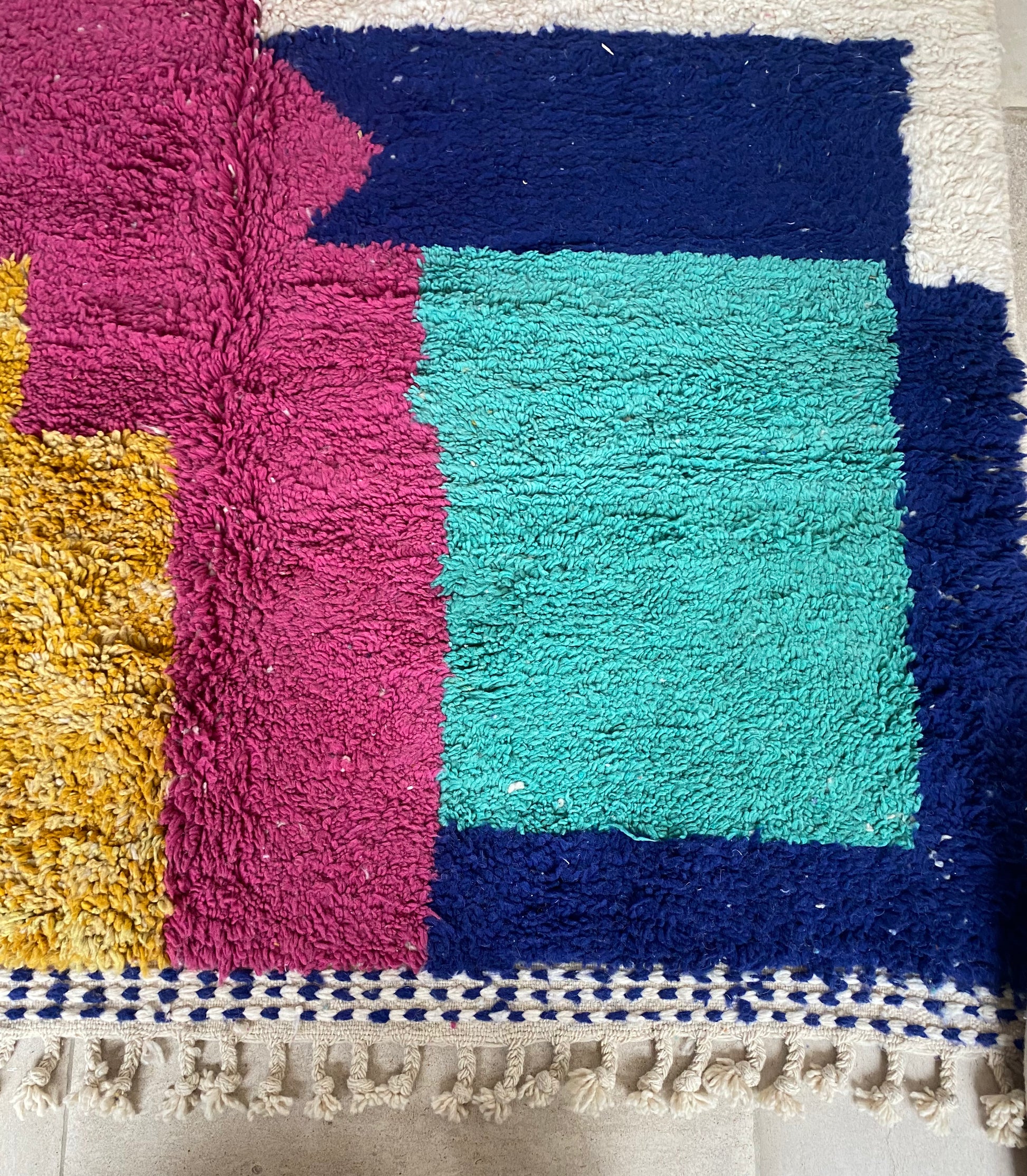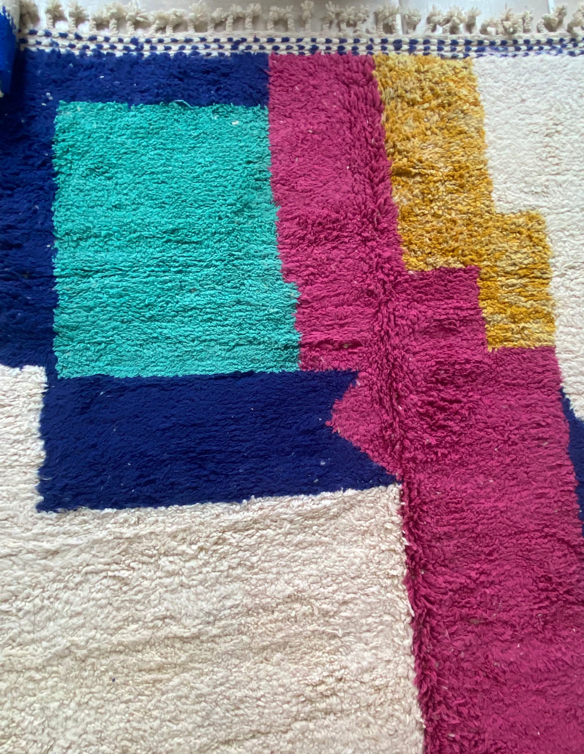 Add a touch of spice to your space with this fluffy magenta, blue & ochre colored carpet the abstract designs, making it a real eye-catcher in your interior!