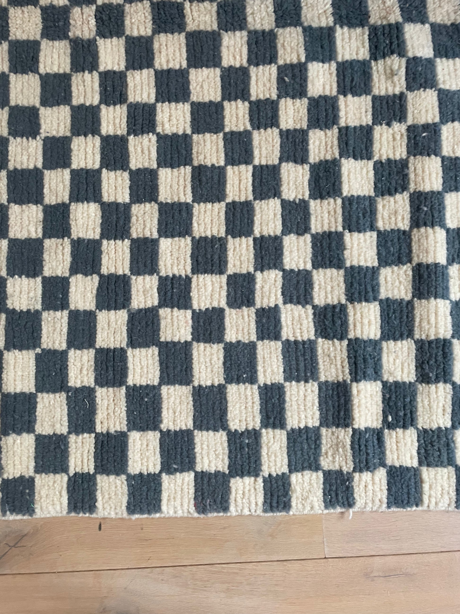 Add a some spice to your space with the captivating charm of a Moroccan beige checkered carpet. Its pattern, bright contrast and soft wool will make you feel like you just made a trip to medinas